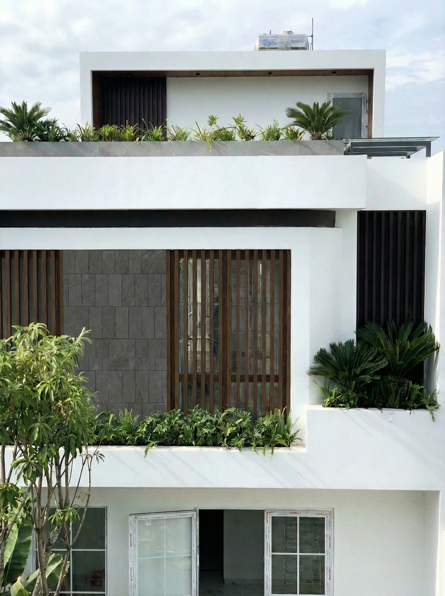 Hình khối kiến trúc mang tinh thần hiện đại – tối giản, nhưng không lạnh lùng. Những “frame” rõ ràng tạo nên nhịp điệu cho mặt đứng, đồng thời định hình các khoảng sống bên trong. Không gian trong và ngoài được kết nối mềm mại, để thiên nhiên không chỉ là cảnh nhìn, mà trở thành một phần của đời sống hằng ngày.