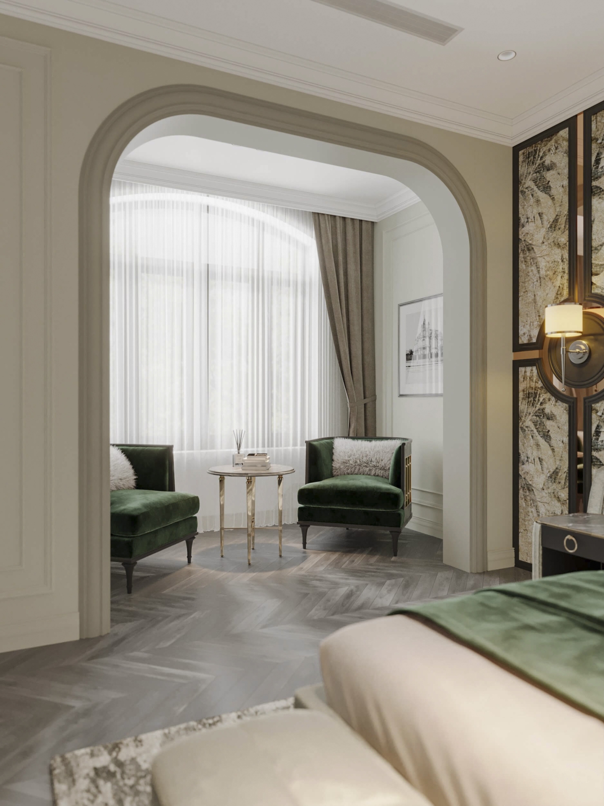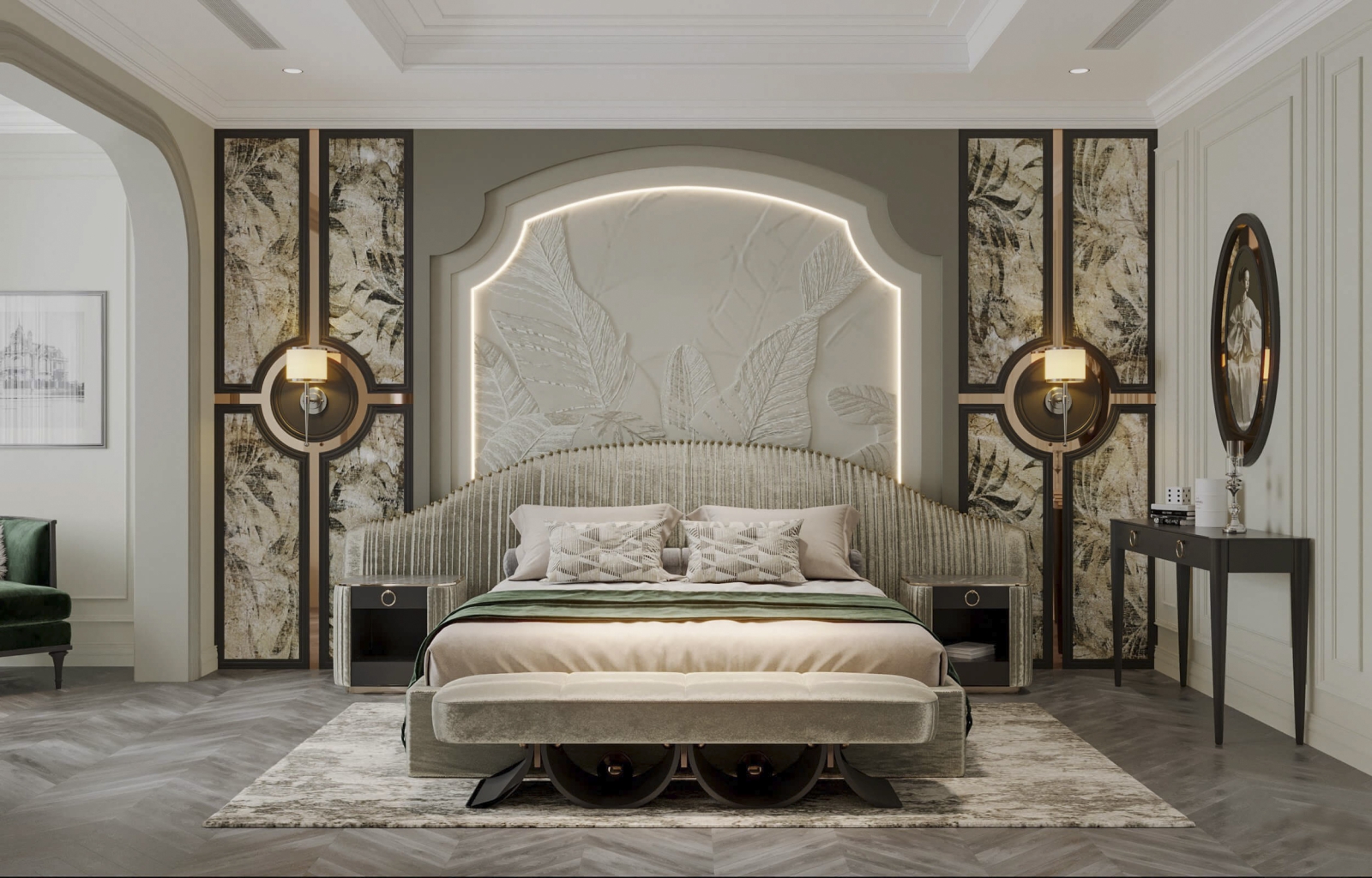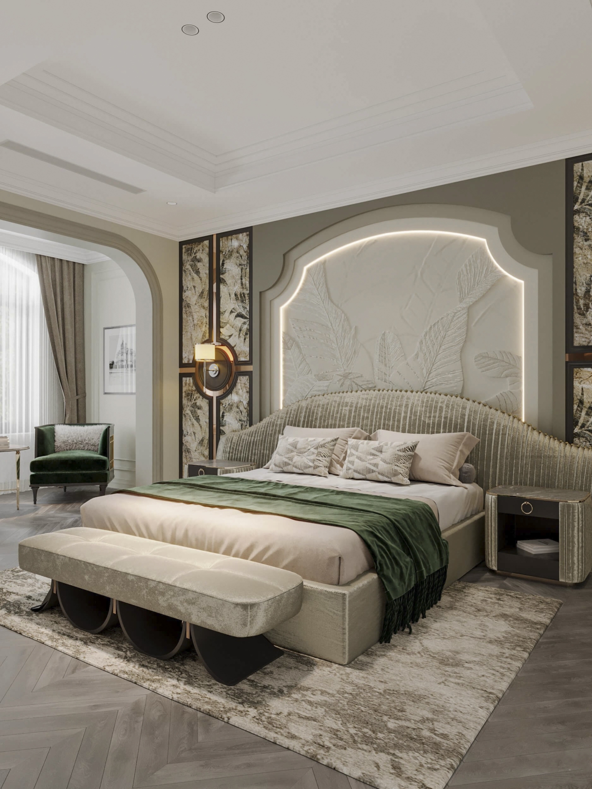 Phong ngủ master indochina kết hợp hiện đại, phong cách indochine được thể hiện qua các vật liệu sử dụng và màu sắc, chi tiết nội thất.