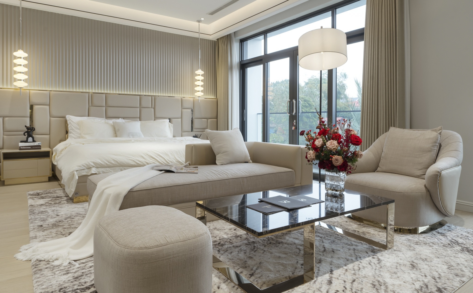 Phòng ngủ sang trọng là một không gian nghỉ ngơi tuyệt vời, nơi bạn có thể tận hưởng sự thoải mái và tiện nghi tối đa. Với thiết kế tinh tế và các chi tiết cao cấp, phòng ngủ sang trọng tạo ra không gian thuần khiết, thanh lịch và ấm cúng. Ánh sáng trong phòng ngủ sang trọng thường được điều chỉnh tinh tế, tạo không gian ấm áp và thư giãn. Đèn chùm hoặc đèn bàn pha lê tạo nên bầu không gian lãng mạn và sang trọng. Những bức tranh nghệ thuật hoặc tác phẩm điêu khắc được treo tường để tạo điểm nhấn và mang đến vẻ đẹp nghệ thuật cho phòng ngủ.